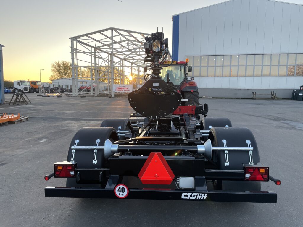 Pod obchodním označením TN CTS 12-45-S-HNJ jsme vyrobili dvounápravový návěs s odpruženou ojí a 17‘ koly, s mechanismem CTS o manipulačním výkonu 12 tun pro celkovou délku kontejneru 5 100 mm a hydraulickým jeřábem HMF 910-K2 RCS. Největší technicky přípustná hmotnost vozidla činí 12 800 kg (váženo na nápravách).