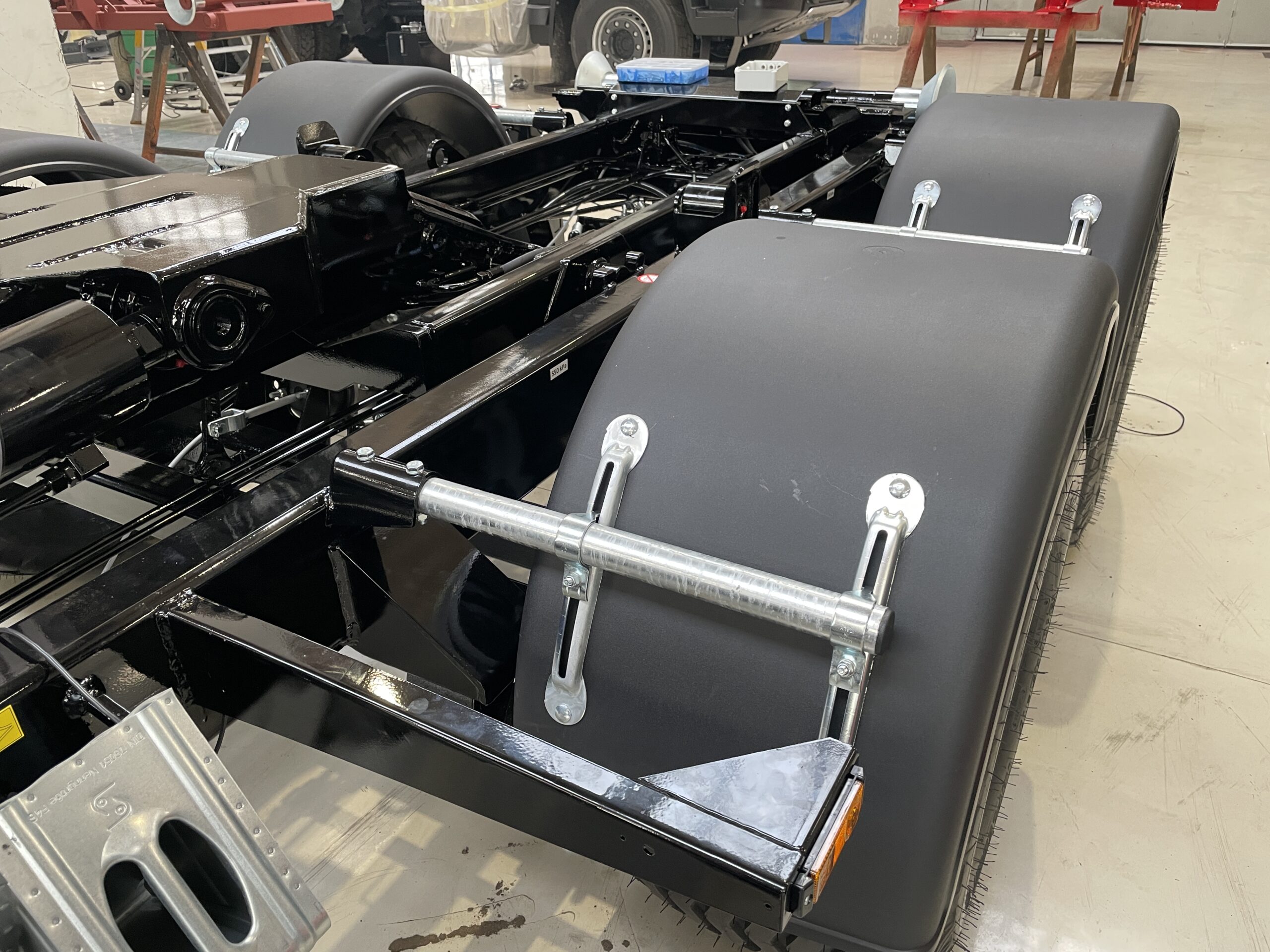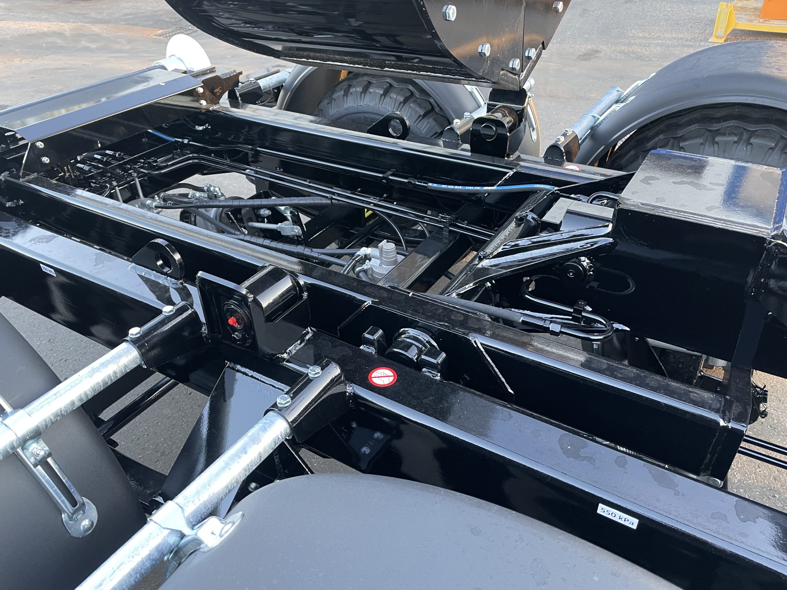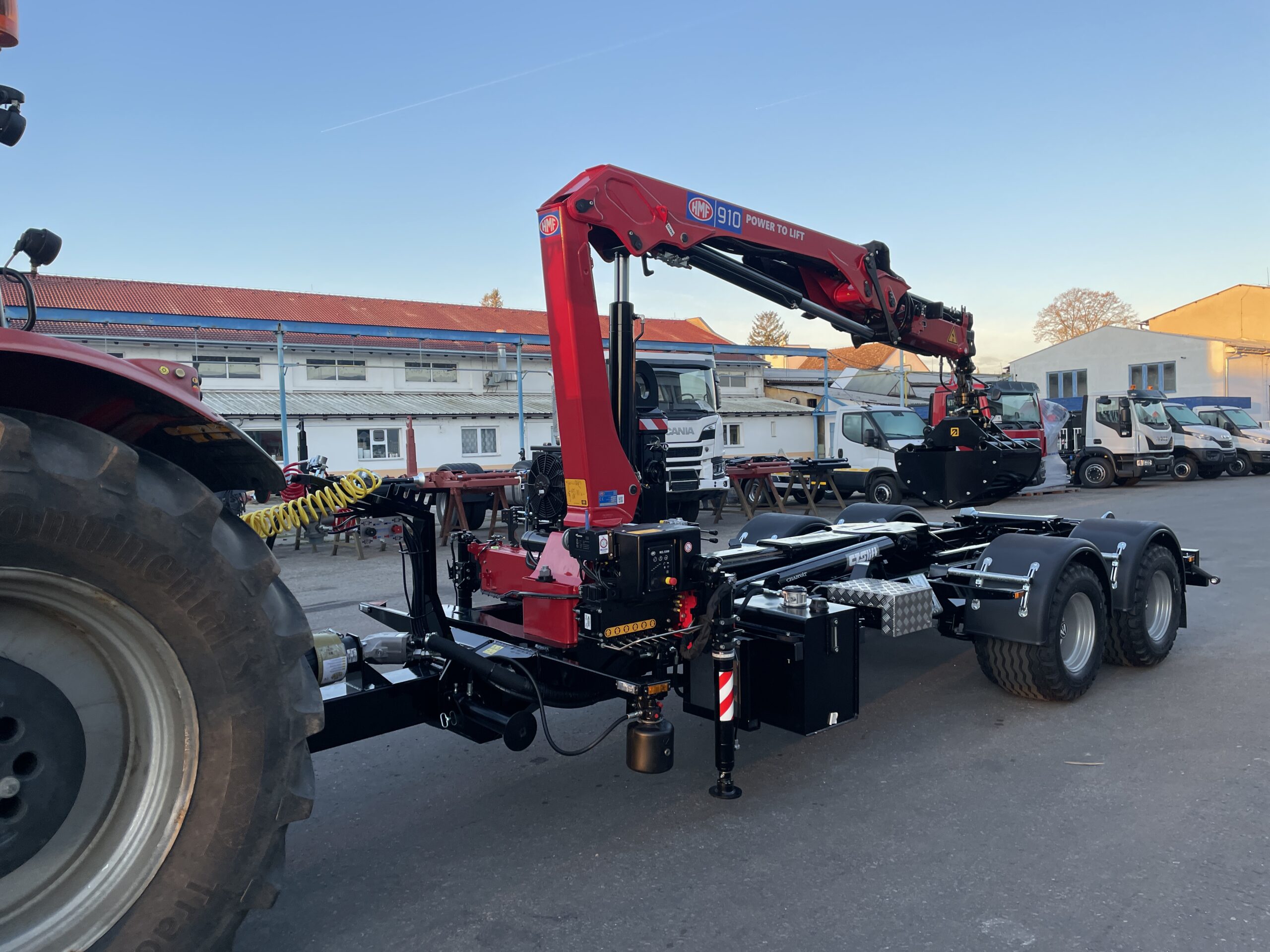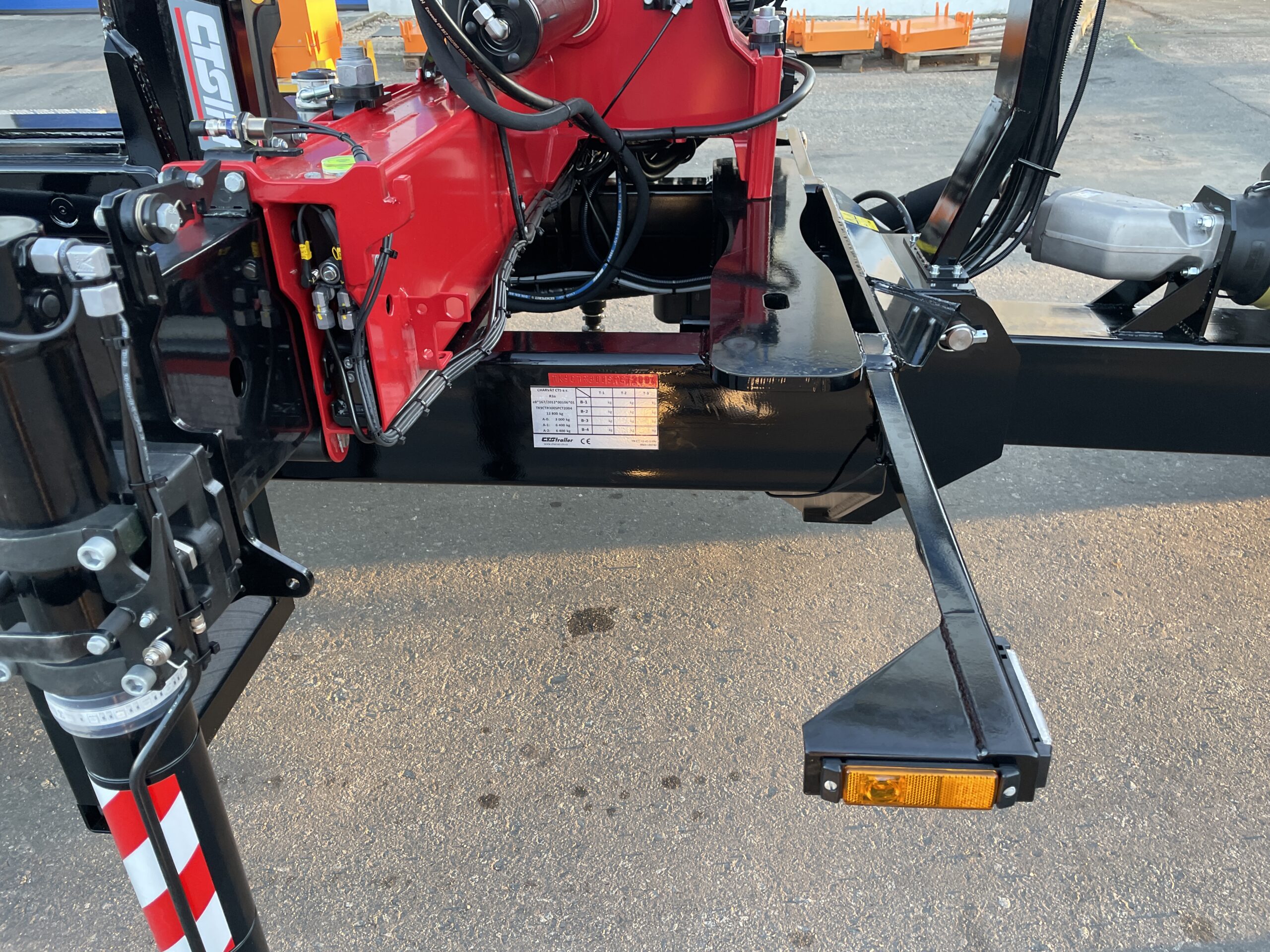 Pod obchodním označením TN CTS 12-45-S-HNJ jsme vyrobili dvounápravový návěs s odpruženou ojí a 17‘ koly, s mechanismem CTS o manipulačním výkonu 12 tun pro celkovou délku kontejneru 5 100 mm a hydraulickým jeřábem HMF 910-K2 RCS. Největší technicky přípustná hmotnost vozidla činí 12 800 kg (váženo na nápravách).